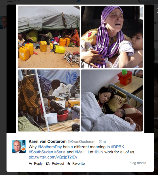 It’s Mother’s Day, and as I sit here drinking my coffee and browsing through my Twitter feed, I’m reminded of the amazing role mothers play around the world. I was struck in particular by this post from Karl van Oosterom, Permanent Representative to the UN from the Kingdom of the Netherlands. These pictures are a stark reminder that Mother’s Day is more than Sunday brunches and flowers. It’s a day to reflect on the sacrifices mothers around the world make each day.